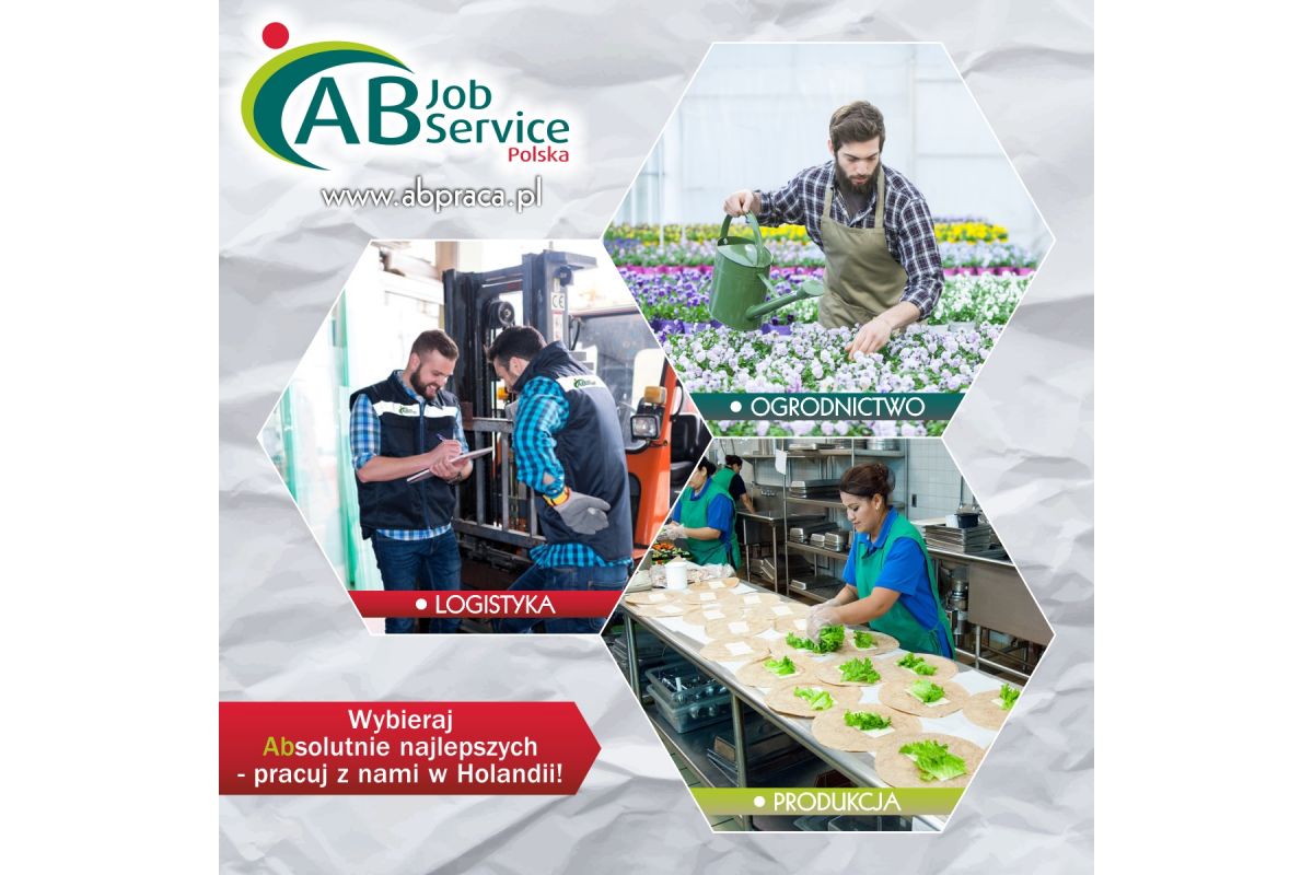 Jako AB Job Service Polska Sp. z o.o. - jesteśmy polską agencją zatrudnienia (nr cert. 5971) z 17-letnim doświadczeniem z oddziałami w Kielcach, Opolu, Lublinie i Bydgoszczy, rekrutującą na rynek niderlandzki. Jesteśmy partnerem w dobieraniu kadry dla firm z branży agrarnej, budowlanej, spożywczej, zieleni (miejskiej), infrastruktury, logistyki, techniki i transportu. Dzięki naszym długotrwałym relacjom z klientami o kilkudziesięcioletniej tradycji znamy ich potrzeby związane z zatrudnieniem pracowników. Nasze korzenie przekładają się na prostotę oraz przyjazną, niewymuszoną atmosferę w kontaktach z kandydatami.